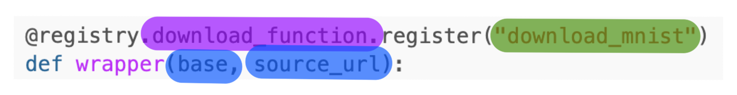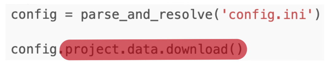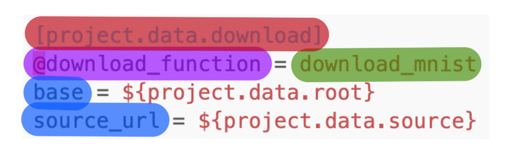 Parsing as we have done previously will only return the string form of the function, i.e., config.project.data.download == "@download_function". Resolving it, will search for a registered function under the name download_mnist and assign it to the variable so that it can be called like so -
